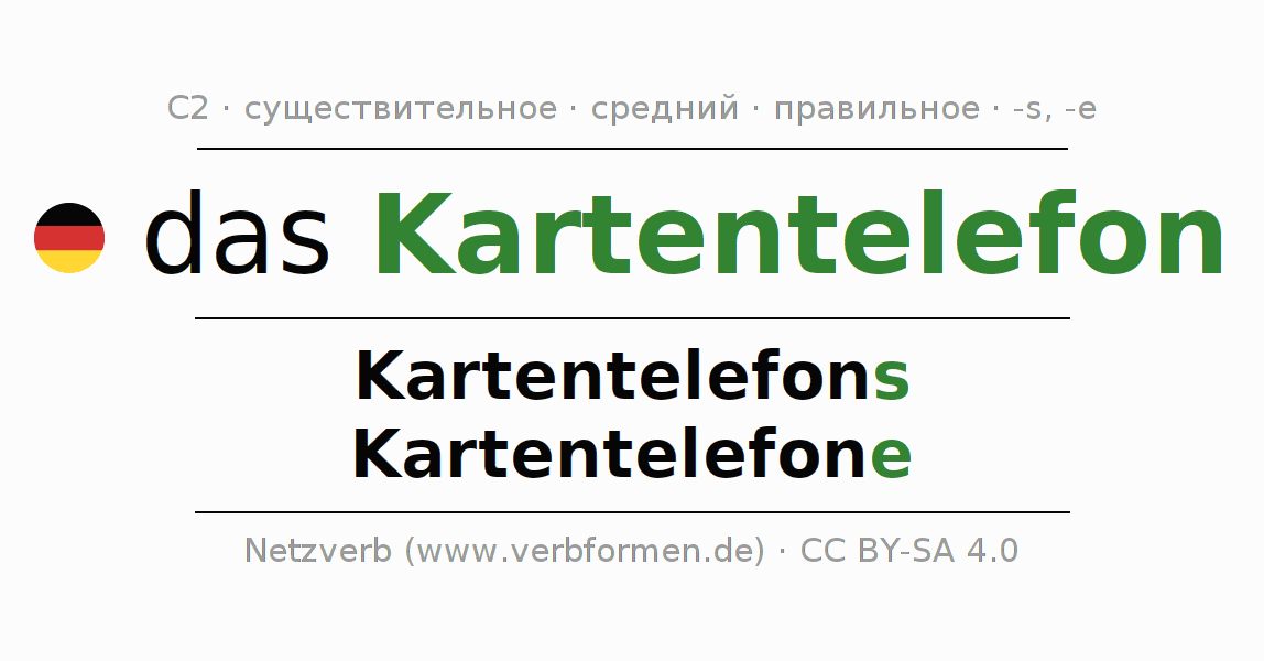 - Множественное число: die Kartentelefone, der Kartentelefone, den Kartentelefonen, die Kartentelefone