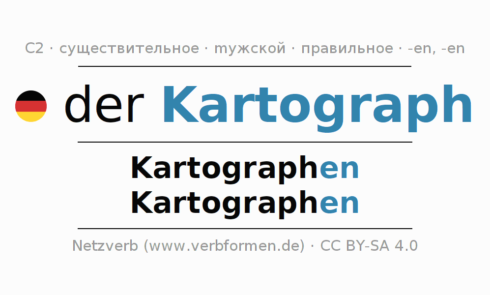 - Единственное число: der Kartograph, des Kartographen, dem Kartographen, den Kartographen