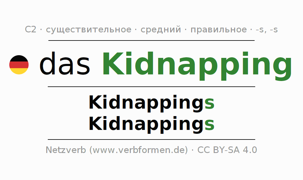 - Единственное число: das Kidnapping, des Kidnappings, dem Kidnapping, das Kidnapping