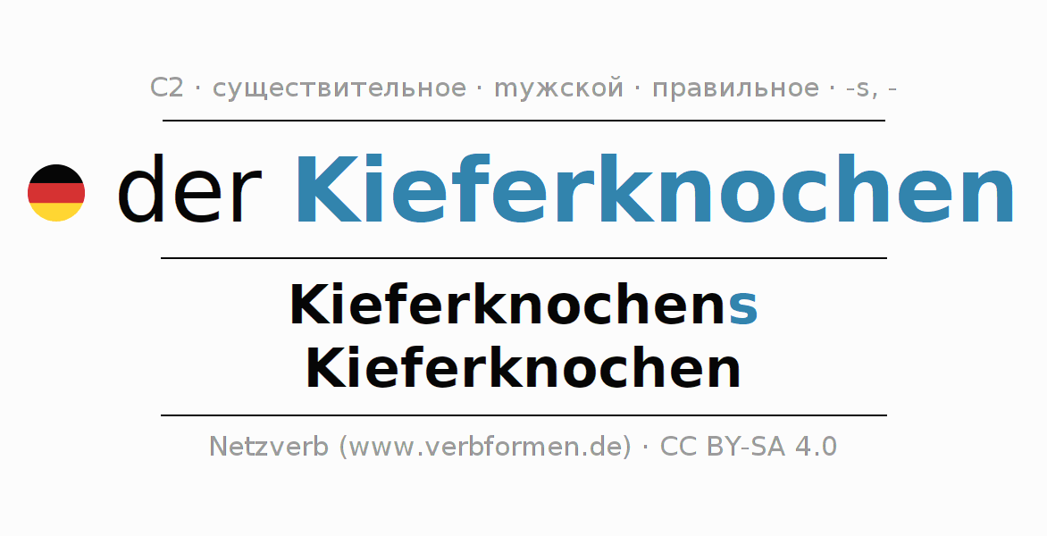 - Единственное число: der Kieferknochen, des Kieferknochens, dem Kieferknochen, den Kieferknochen