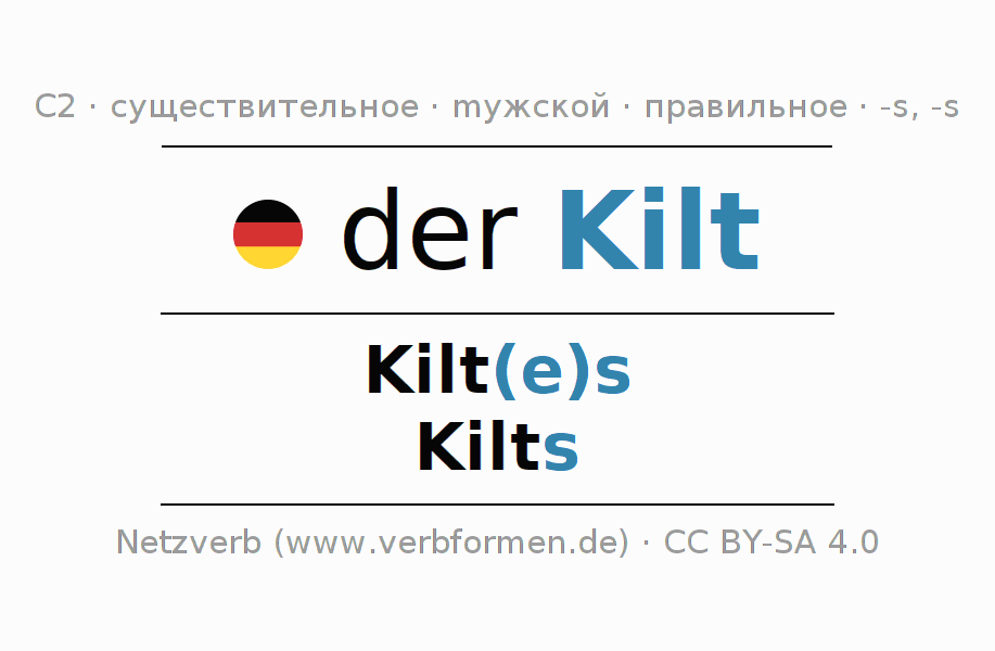 - Множественное число: die Kilts, der Kilts, den Kilts, die Kilts