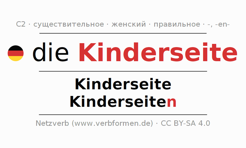 - Множественное число: die Kinderseiten, der Kinderseiten, den Kinderseiten, die Kinderseiten
