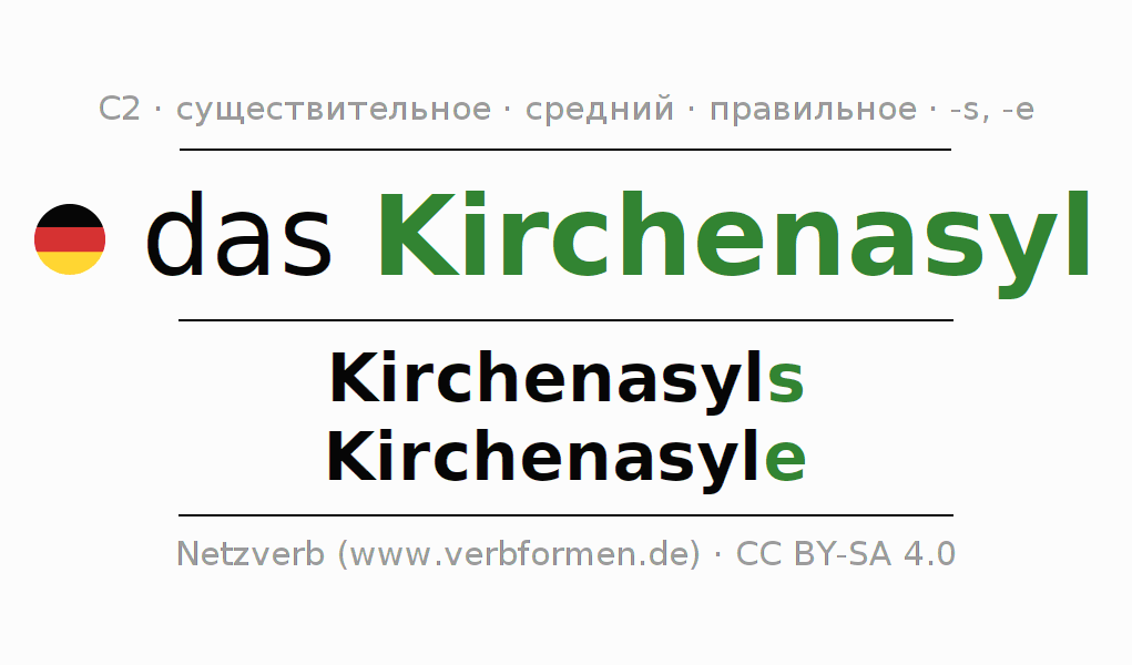 Склонение существительного Kirchenasyl (церковное убежище) даётся в родительном падеже единственного числаKirchenasyls и в именительном падеже множественного числа Kirchenasyle. Существительное Kirchenasyl склоняется по сильному типу, получая окончания s/e. Грамматический род Kirchenasyl средний с определённым артиклем "das" Здесь можно просклонять не только Kirchenasyl, но и все немецкие существительные. Существительное включён в словарный запас обладателя сертификата знания немецкого языка уровня C2. Kомментарии ☆