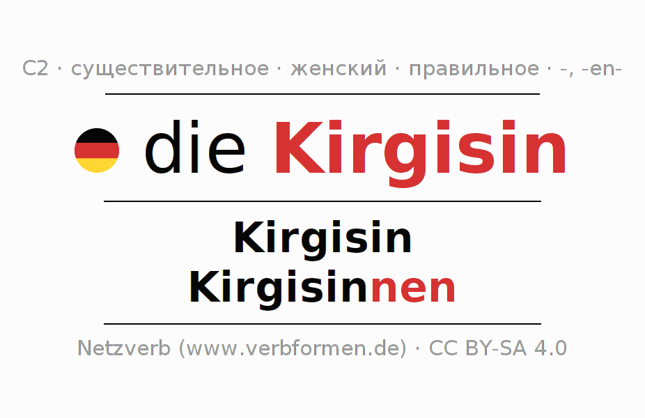 - Множественное число: die Kirgisinnen, der Kirgisinnen, den Kirgisinnen, die Kirgisinnen