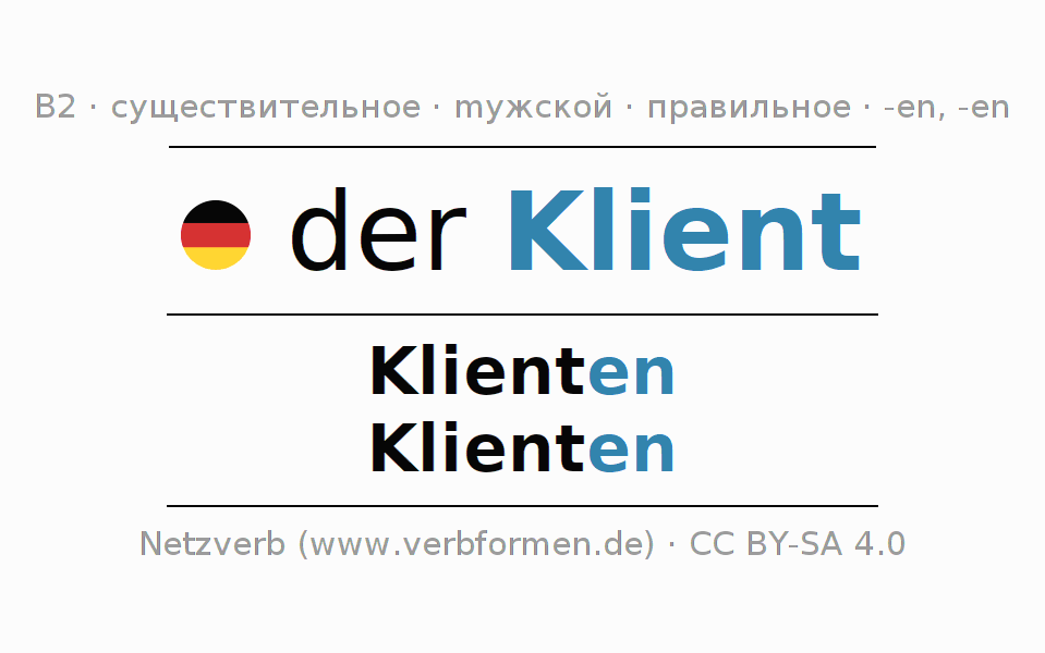 - Множественное число: die Klienten, der Klienten, den Klienten, die Klienten