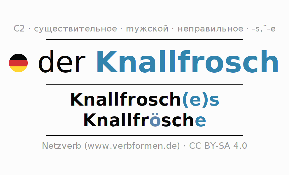 Склонение существительного Knallfrosch (пета́рда, петарда) даётся в родительном падеже единственного числаKnallfrosch(e)s и в именительном падеже множественного числа Knallfrösche. Существительное Knallfrosch склоняется по сильному типу, получая окончания es/ö-e. Во множественном числе стоит умлаут. Грамматический род Knallfrosch мужской с определённым артиклем "der" Здесь можно просклонять не только Knallfrosch, но и все немецкие существительные. Существительное включён в словарный запас обладателя сертификата знания немецкого языка уровня C2. Kомментарии ☆
