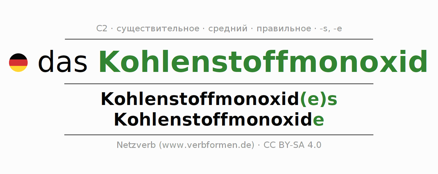 Склонение существительного Kohlenstoffmonoxid (монооксид углерода, угарный газ) даётся в родительном падеже единственного числаKohlenstoffmonoxid(e)s и в именительном падеже множественного числа Kohlenstoffmonoxide. Существительное Kohlenstoffmonoxid склоняется по сильному типу, получая окончания es/e. Грамматический род Kohlenstoffmonoxid средний с определённым артиклем "das" Здесь можно просклонять не только Kohlenstoffmonoxid, но и все немецкие существительные. Существительное включён в словарный запас обладателя сертификата знания немецкого языка уровня C2. Kомментарии ☆