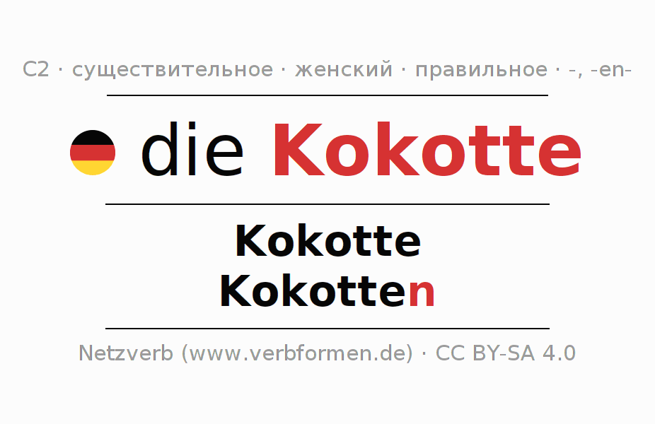 - Множественное число: die Kokotten, der Kokotten, den Kokotten, die Kokotten