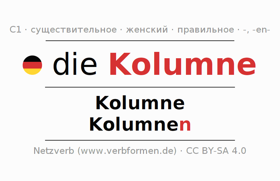 - Множественное число: die Kolumnen, der Kolumnen, den Kolumnen, die Kolumnen