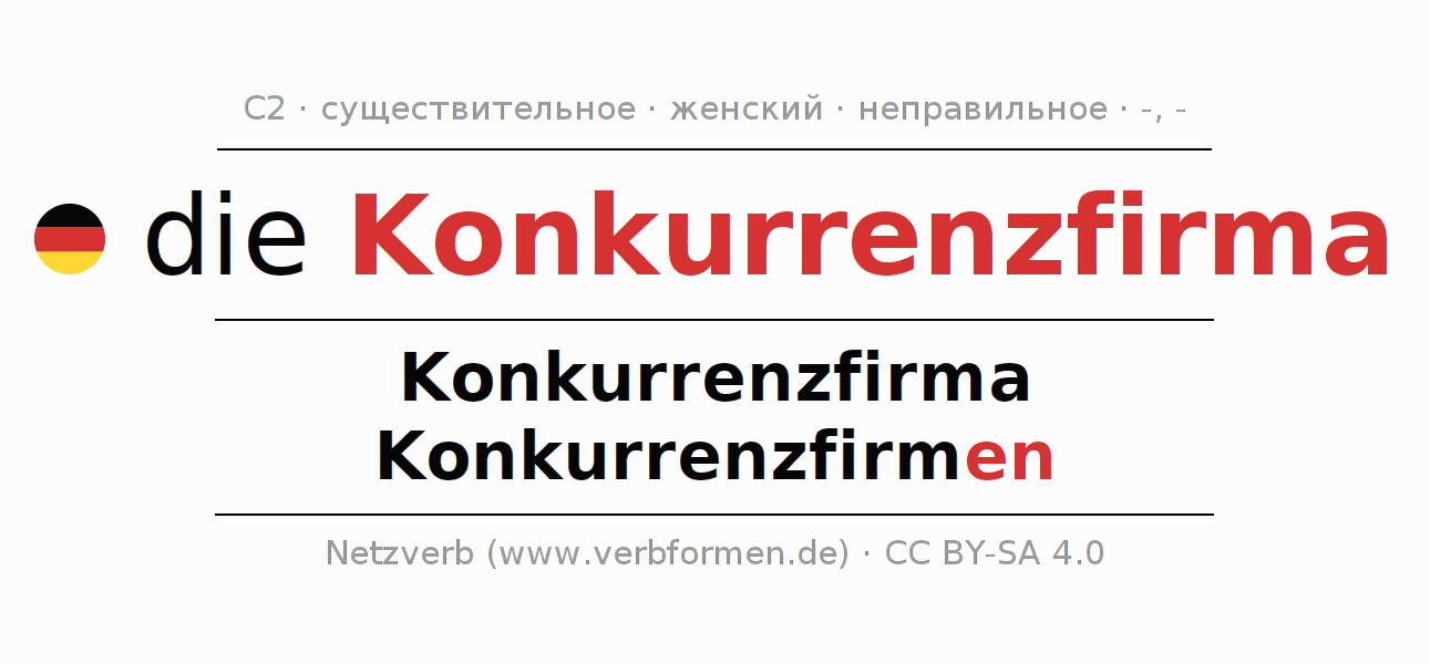 - Единственное число: die Konkurrenzfirma, der Konkurrenzfirma, der Konkurrenzfirma, die Konkurrenzfirma