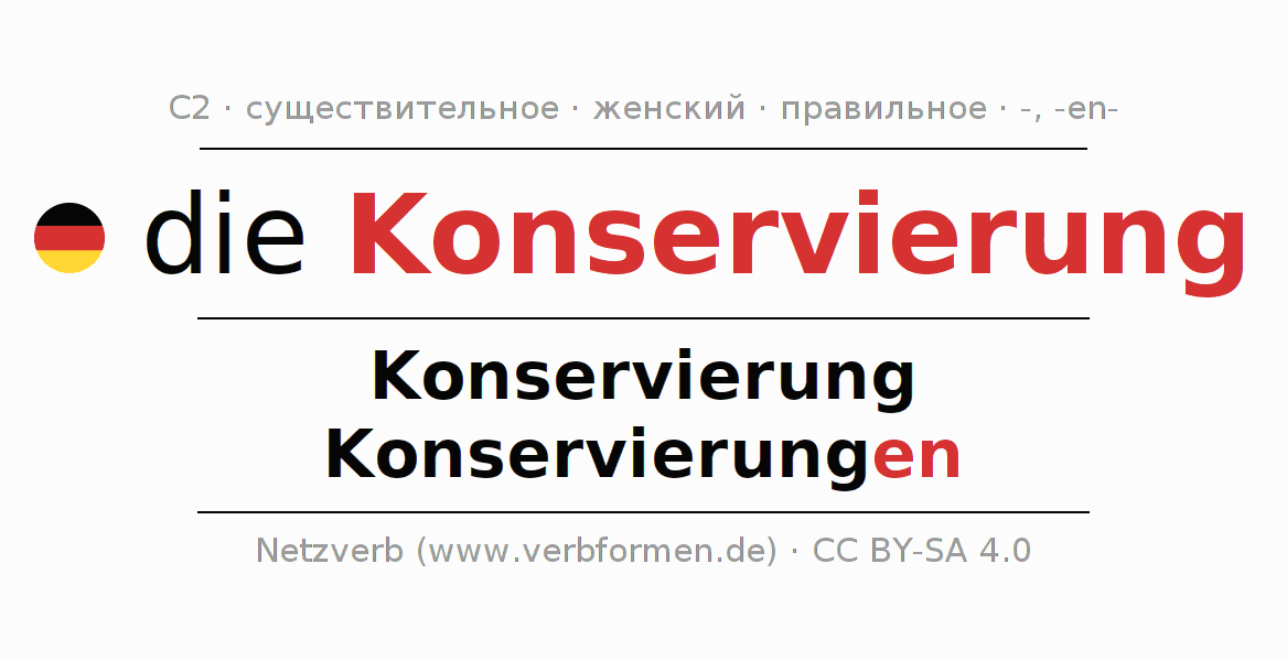 - Единственное число: die Konservierung, der Konservierung, der Konservierung, die Konservierung