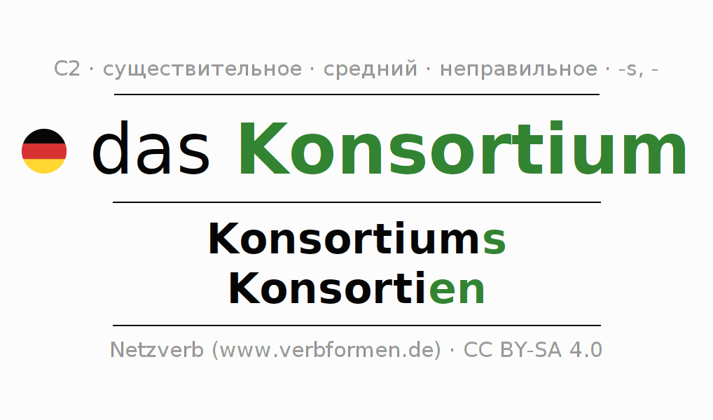 - Единственное число: das Konsortium, des Konsortiums, dem Konsortium, das Konsortium