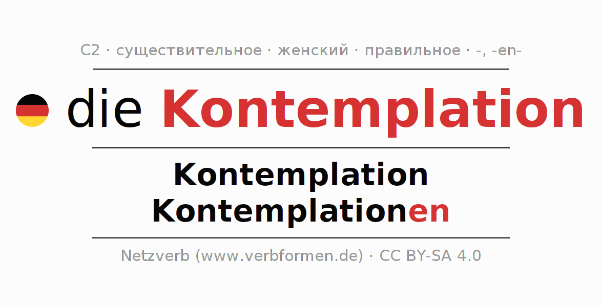 - Единственное число: die Kontemplation, der Kontemplation, der Kontemplation, die Kontemplation