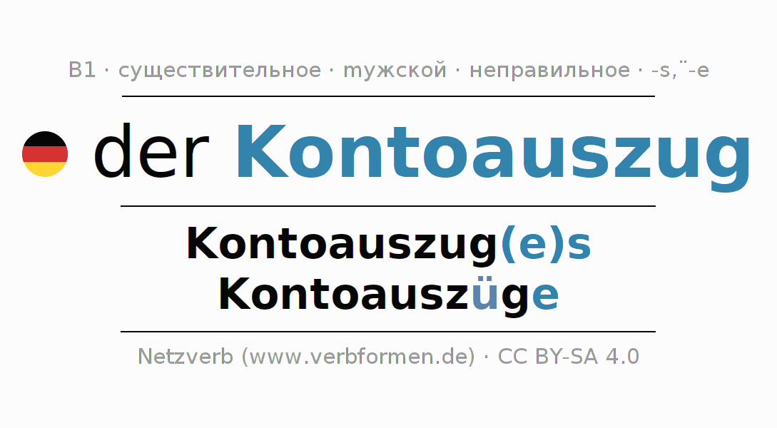 - Множественное число: die Kontoauszüge, der Kontoauszüge, den Kontoauszügen, die Kontoauszüge