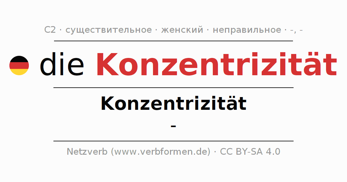 - Единственное число: die Konzentrizität, der Konzentrizität, der Konzentrizität, die Konzentrizität