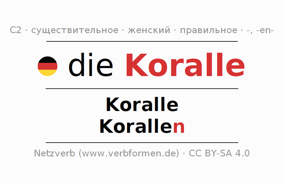 - Единственное число: die Koralle, der Koralle, der Koralle, die Koralle