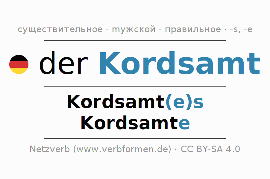 - Единственное число: der Kordsamt, des Kordsamt(e)s, dem Kordsamt(e), den Kordsamt
