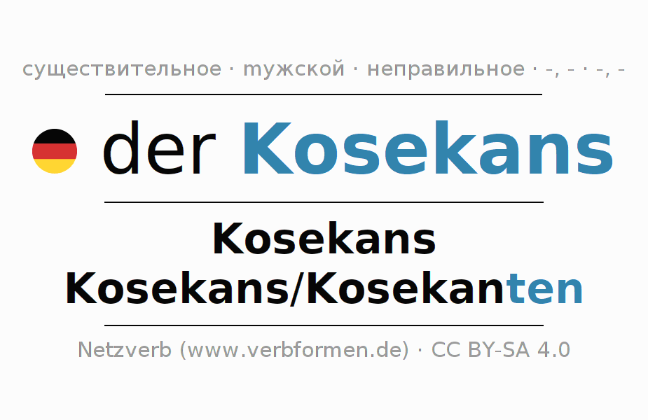 Склонение существительного Kosekans (косе́канс, косекант) даётся в родительном падеже единственного числаKosekans и в именительном падеже множественного числа Kosekans/Kosekanten. Существительное Kosekans при склонении получает окончания -/s/ten. Грамматический род Kosekans мужской с определённым артиклем "der" Здесь можно просклонять не только Kosekans, но и все немецкие существительные. Kомментарии ☆