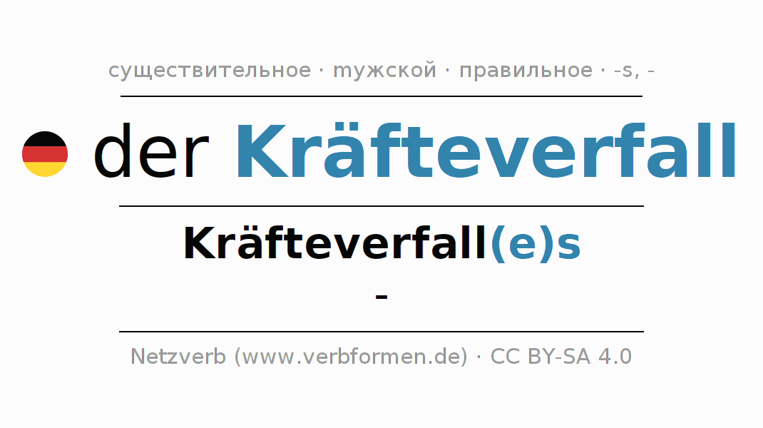 Склонение существительного Kräfteverfall (упа́док сил, ослабление) даётся в родительном падеже единственного числаKräfteverfall(e)s и в именительном падеже множественного числа -. Существительное Kräfteverfall склоняется по сильному типу, получая окончания es/-. Не образует форм множественного числа. Грамматический род Kräfteverfall мужской с определённым артиклем "der" Здесь можно просклонять не только Kräfteverfall, но и все немецкие существительные. Kомментарии ☆