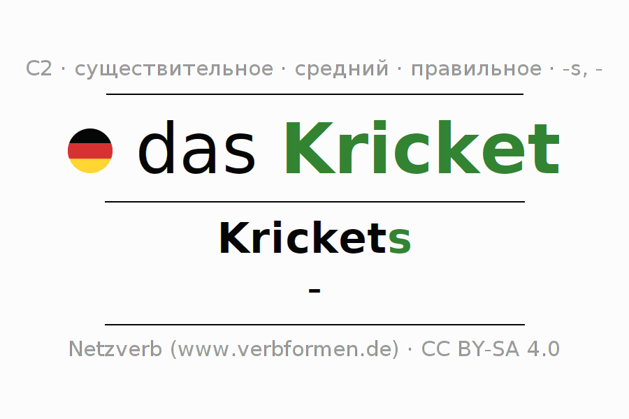 Склонение существительного Kricket (крикет) даётся в родительном падеже единственного числаKrickets и в именительном падеже множественного числа -. Существительное Kricket склоняется по сильному типу, получая окончания s/-. Не образует форм множественного числа. Грамматический род Kricket средний с определённым артиклем "das" Здесь можно просклонять не только Kricket, но и все немецкие существительные. Существительное включён в словарный запас обладателя сертификата знания немецкого языка уровня C2. Kомментарии ☆