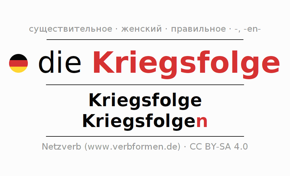 - Множественное число: die Kriegsfolgen, der Kriegsfolgen, den Kriegsfolgen, die Kriegsfolgen