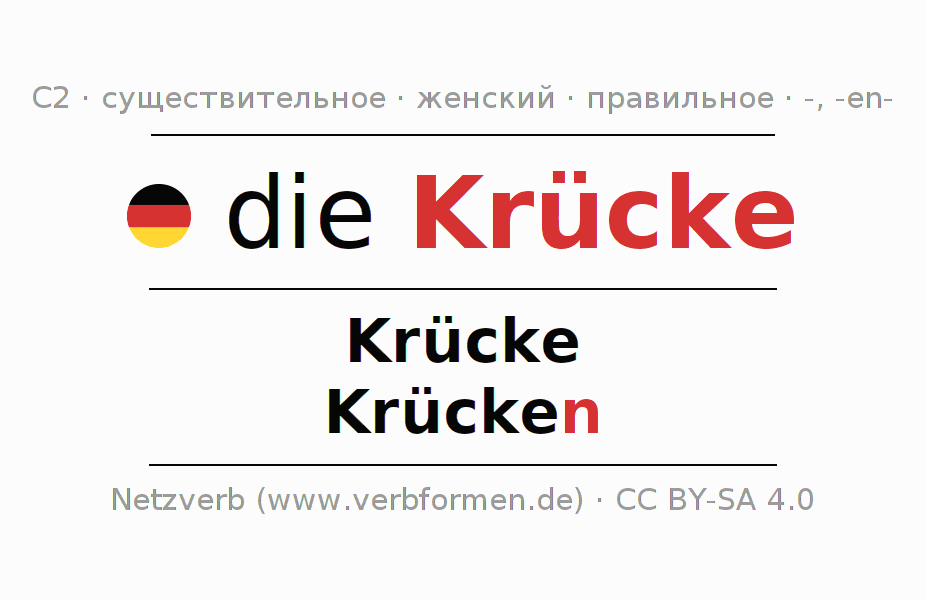 Склонение существительного Krücke (костыль, клюка) даётся в родительном падеже единственного числаKrücke и в именительном падеже множественного числа Krücken. Существительное Krücke склоняется по слабому типу, получая окончания -/n. Грамматический род Krücke женский с определённым артиклем "die" Здесь можно просклонять не только Krücke, но и все немецкие существительные. Существительное включён в словарный запас обладателя сертификата знания немецкого языка уровня C2. Kомментарии ☆