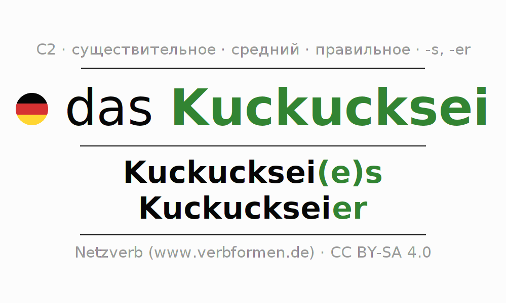 - Множественное число: die Kuckuckseier, der Kuckuckseier, den Kuckuckseiern, die Kuckuckseier