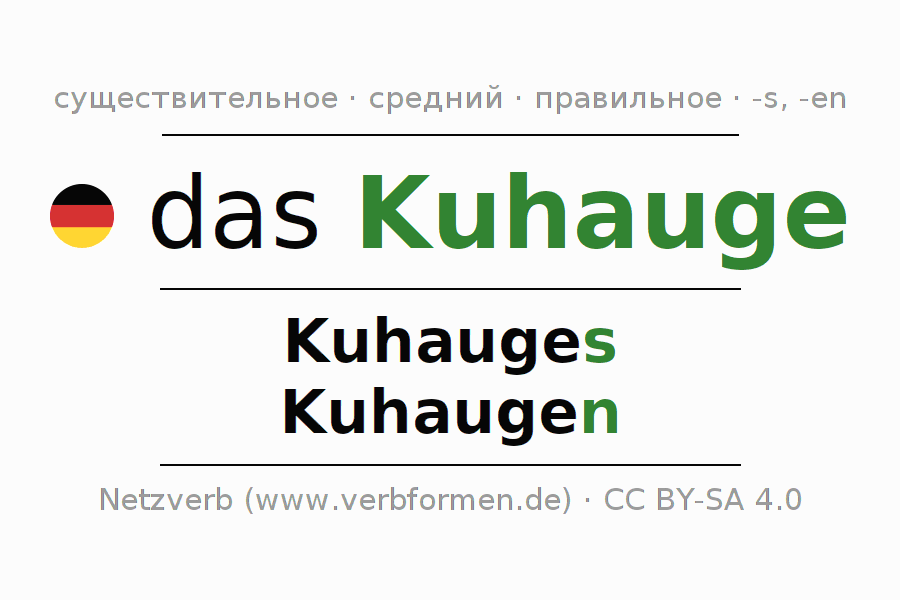 Склонение существительного Kuhauge даётся в родительном падеже единственного числаKuhauges и в именительном падеже множественного числа Kuhaugen. Существительное Kuhauge склоняется по смешанному типу, получая окончания s/n. Грамматический род Kuhauge средний с определённым артиклем "das" Здесь можно просклонять не только Kuhauge, но и все немецкие существительные. Kомментарии ☆