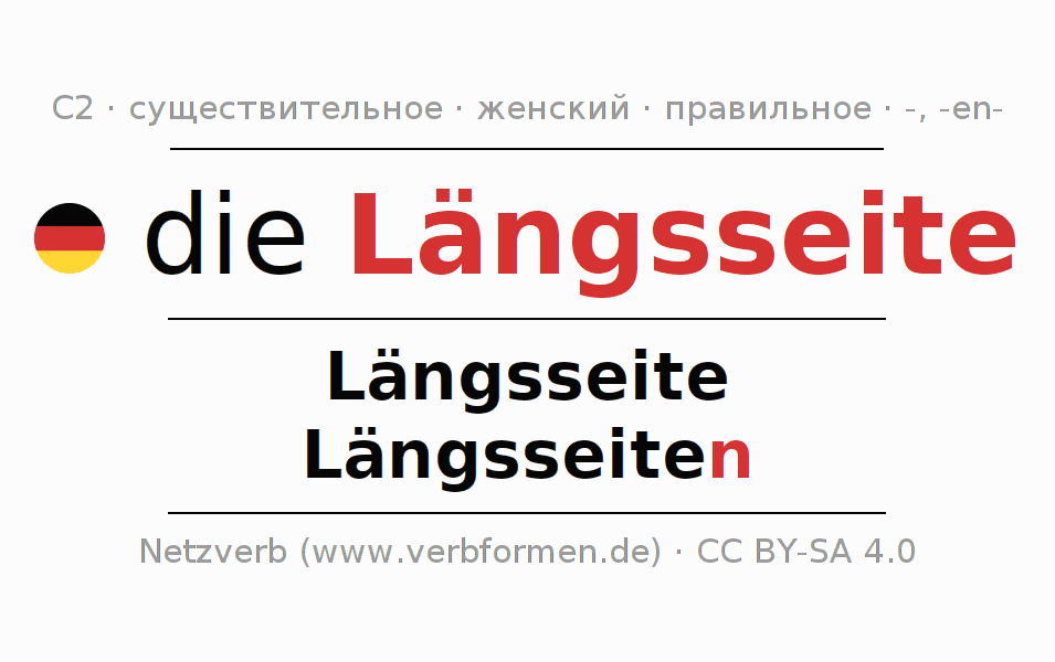 Склонение существительного Längsseite (бокова́я сторона́, дли́нная сторона́) даётся в родительном падеже единственного числаLängsseite и в именительном падеже множественного числа Längsseiten. Существительное Längsseite склоняется по слабому типу, получая окончания -/n. Грамматический род Längsseite женский с определённым артиклем "die" Здесь можно просклонять не только Längsseite, но и все немецкие существительные. Существительное включён в словарный запас обладателя сертификата знания немецкого языка уровня C2. Kомментарии ☆