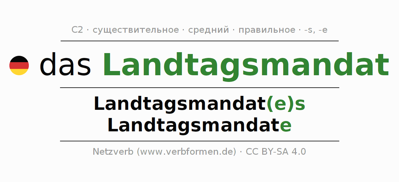 - Множественное число: die Landtagsmandate, der Landtagsmandate, den Landtagsmandaten, die Landtagsmandate