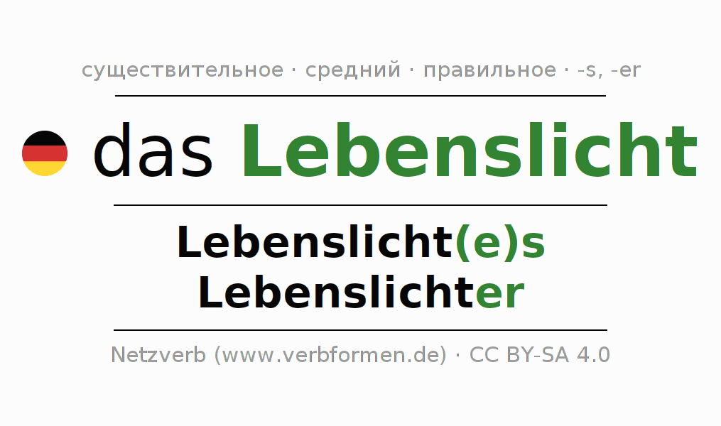 - Единственное число: das Lebenslicht, des Lebenslicht(e)s, dem Lebenslicht(e), das Lebenslicht