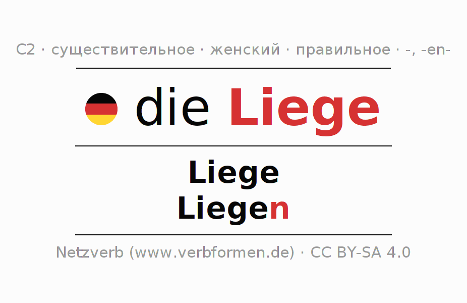 - Единственное число: die Liege, der Liege, der Liege, die Liege