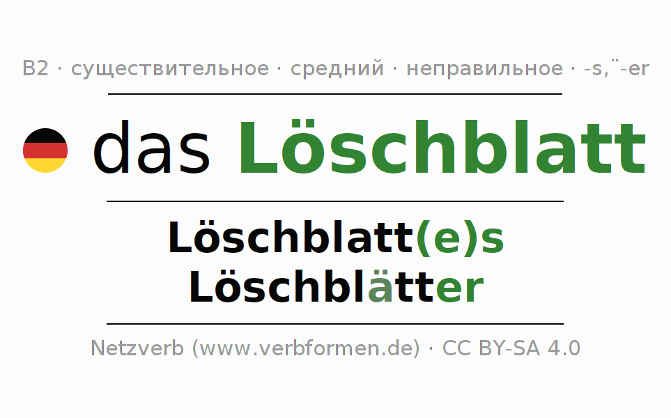 Склонение существительного Löschblatt (впитывающая бумага, промока́тельная бума́га) даётся в родительном падеже единственного числаLöschblatt(e)s и в именительном падеже множественного числа Löschblätter. Существительное Löschblatt склоняется по сильному типу, получая окончания es/ä-er. Во множественном числе стоит умлаут. Грамматический род Löschblatt средний с определённым артиклем "das" Здесь можно просклонять не только Löschblatt, но и все немецкие существительные. Существительное включён в словарный запас обладателя сертификата знания немецкого языка уровня B2. Kомментарии ☆
