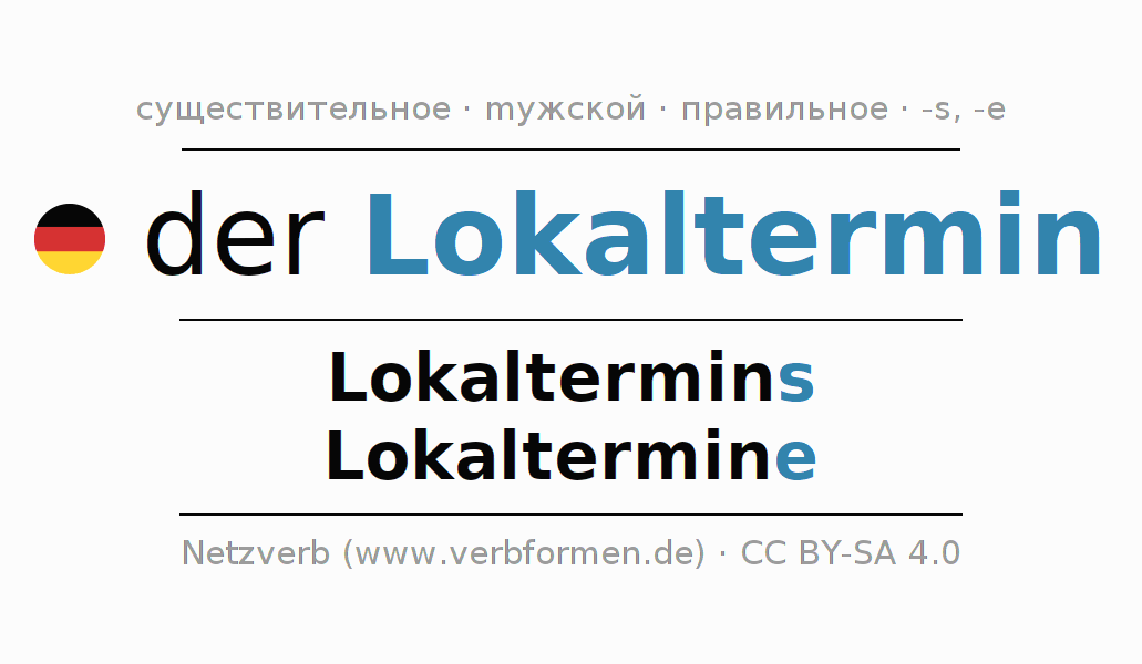 - Единственное число: der Lokaltermin, des Lokaltermins, dem Lokaltermin, den Lokaltermin