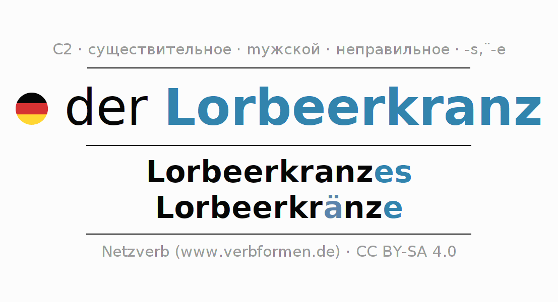Склонение существительного Lorbeerkranz (лавровый венок, ла́вровый вено́к) даётся в родительном падеже единственного числаLorbeerkranzes и в именительном падеже множественного числа Lorbeerkränze. Существительное Lorbeerkranz склоняется по сильному типу, получая окончания es/ä-e. Во множественном числе стоит умлаут. Грамматический род Lorbeerkranz мужской с определённым артиклем "der" Здесь можно просклонять не только Lorbeerkranz, но и все немецкие существительные. Существительное включён в словарный запас обладателя сертификата знания немецкого языка уровня C2. Kомментарии ☆