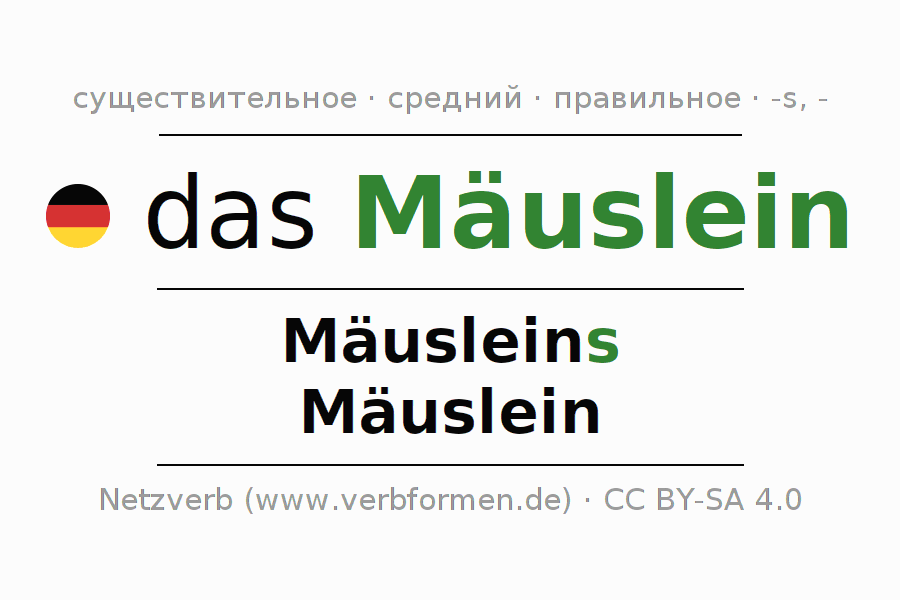 Склонение существительного Mäuslein (мы́шка-нору́шка, мышонок) даётся в родительном падеже единственного числаMäusleins и в именительном падеже множественного числа Mäuslein. Существительное Mäuslein склоняется по сильному типу, получая окончания s/-. Грамматический род Mäuslein средний с определённым артиклем "das" Здесь можно просклонять не только Mäuslein, но и все немецкие существительные. Kомментарии ☆