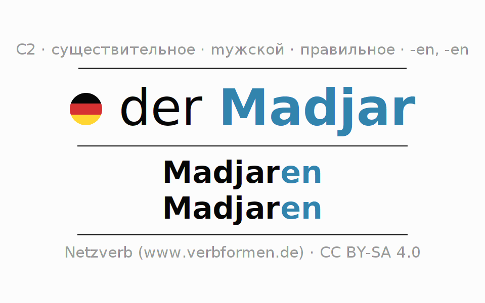 - Множественное число: die Madjaren, der Madjaren, den Madjaren, die Madjaren