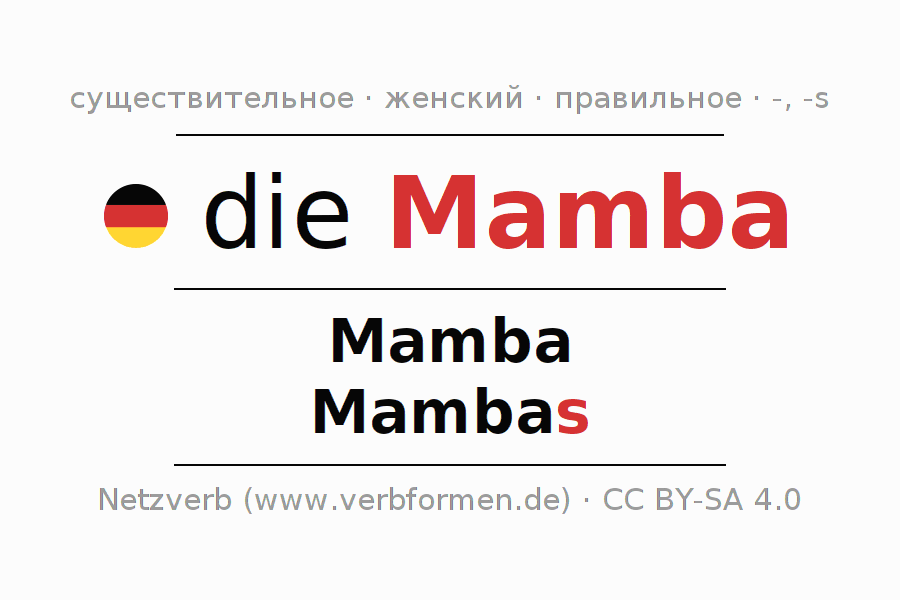 - Единственное число: die Mamba, der Mamba, der Mamba, die Mamba