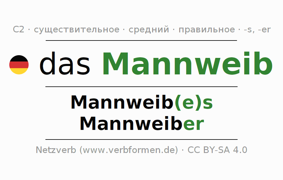Склонение существительного Mannweib (бо́й-ба́ба, гермафроди́т) даётся в родительном падеже единственного числаMannweib(e)s и в именительном падеже множественного числа Mannweiber. Существительное Mannweib склоняется по сильному типу, получая окончания es/er. Грамматический род Mannweib средний с определённым артиклем "das" Здесь можно просклонять не только Mannweib, но и все немецкие существительные. Существительное включён в словарный запас обладателя сертификата знания немецкого языка уровня C2. Kомментарии ☆