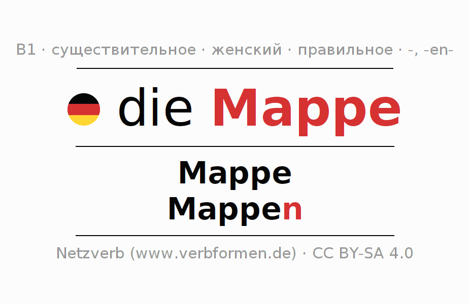 - Множественное число: die Mappen, der Mappen, den Mappen, die Mappen