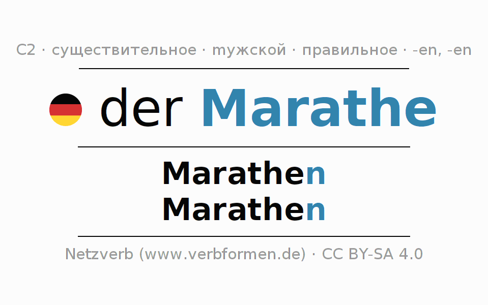 - Единственное число: der Marathe, des Marathen, dem Marathen, den Marathen