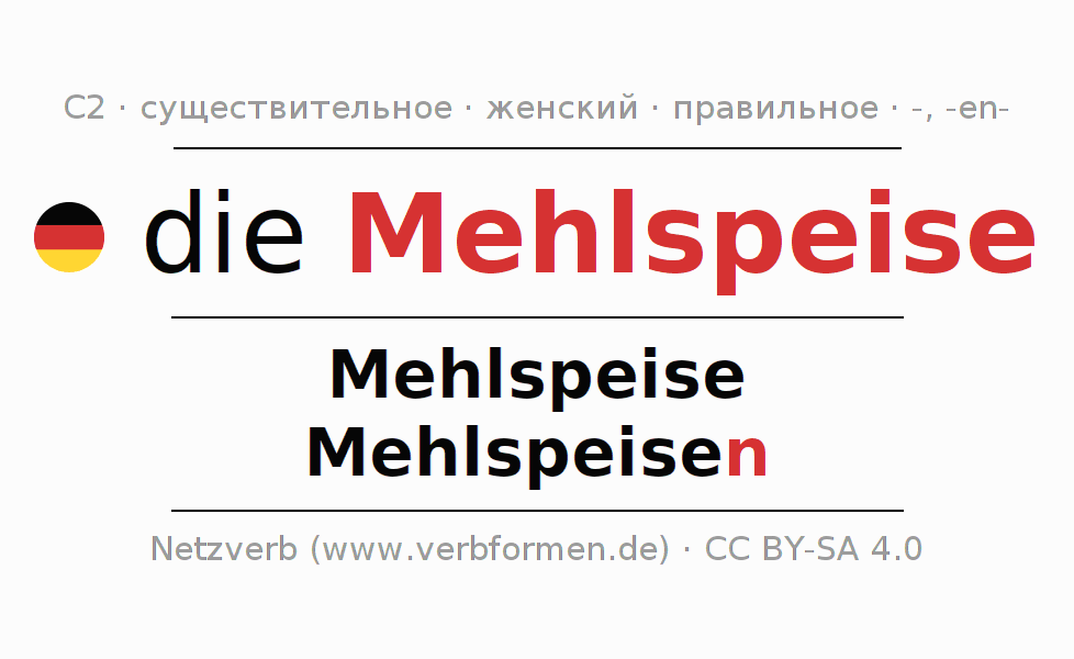 - Единственное число: die Mehlspeise, der Mehlspeise, der Mehlspeise, die Mehlspeise