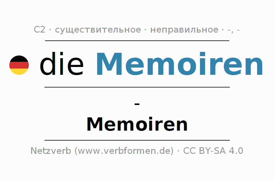 Склонение существительного Memoiren (мемуары) даётся в родительном падеже единственного числа- и в именительном падеже множественного числа Memoiren. Существительное Memoiren при склонении получает окончания /-. Не образует форм единственного числа. Однако существительное может употребляться в другом роде и с другим артиклем. Здесь можно просклонять не только Memoiren, но и все немецкие существительные. Существительное включён в словарный запас обладателя сертификата знания немецкого языка уровня C2. Kомментарии ☆