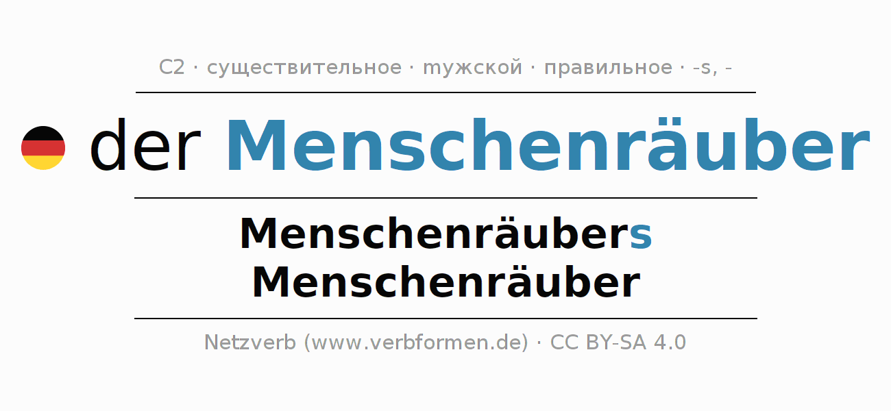 - Множественное число: die Menschenräuber, der Menschenräuber, den Menschenräubern, die Menschenräuber