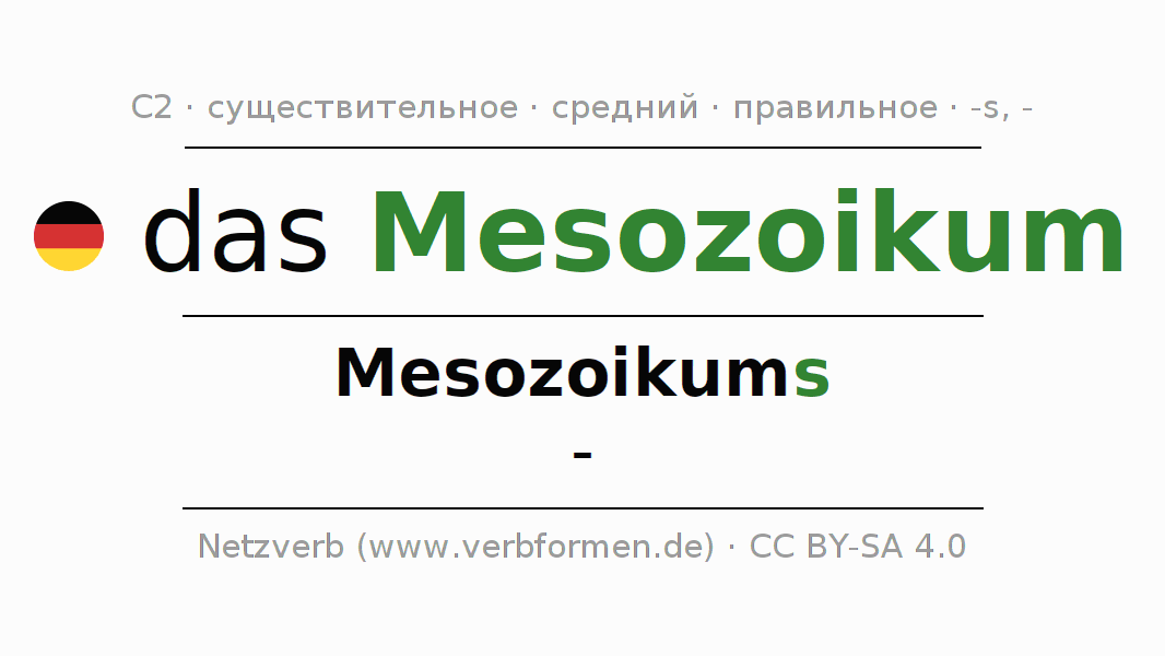 Склонение существительного Mesozoikum (мезозо́й, мезозо́йская э́ра) даётся в родительном падеже единственного числаMesozoikums и в именительном падеже множественного числа -. Существительное Mesozoikum склоняется по сильному типу, получая окончания s/-. Не образует форм множественного числа. Грамматический род Mesozoikum средний с определённым артиклем "das" Здесь можно просклонять не только Mesozoikum, но и все немецкие существительные. Существительное включён в словарный запас обладателя сертификата знания немецкого языка уровня C2. Kомментарии ☆