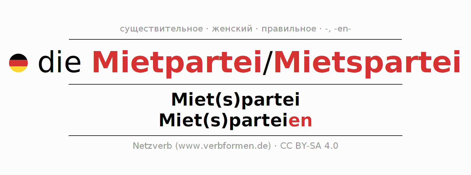 - Единственное число: die Miet(s)partei, der Miet(s)partei, der Miet(s)partei, die Miet(s)partei