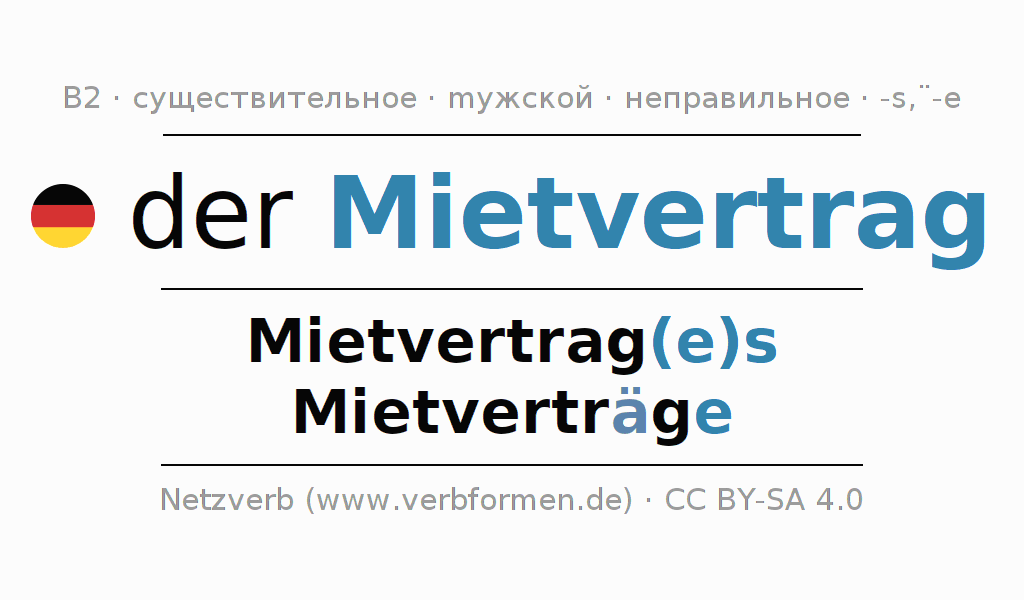 - Множественное число: die Mietverträge, der Mietverträge, den Mietverträgen, die Mietverträge