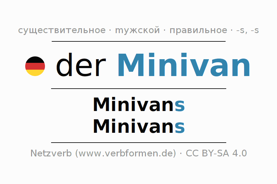 - Единственное число: der Minivan, des Minivans, dem Minivan, den Minivan