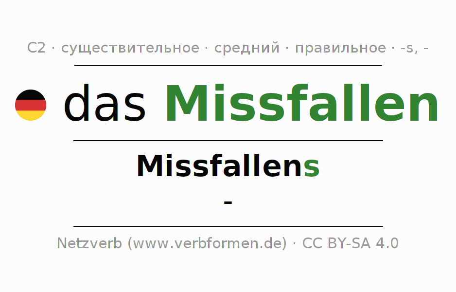 Склонение существительного Missfallen (недовольство, неудовлетворение) даётся в родительном падеже единственного числаMissfallens и в именительном падеже множественного числа -. Существительное Missfallen склоняется по сильному типу, получая окончания s/-. Не образует форм множественного числа. Грамматический род Missfallen средний с определённым артиклем "das" Здесь можно просклонять не только Missfallen, но и все немецкие существительные. Существительное включён в словарный запас обладателя сертификата знания немецкого языка уровня C2. Kомментарии ☆