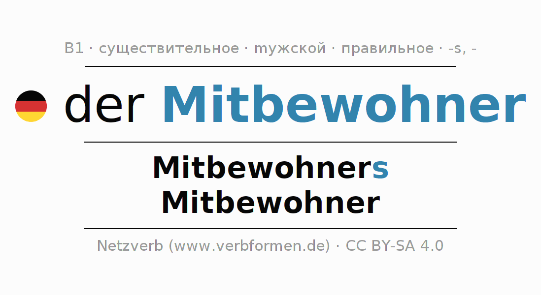 - Множественное число: die Mitbewohner, der Mitbewohner, den Mitbewohnern, die Mitbewohner